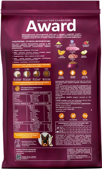 Award - Сухой корм для взрослых собак крупных пород, с курицей и индейкой, с добавлением тыквы и шиповника (2кг)