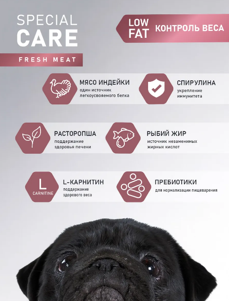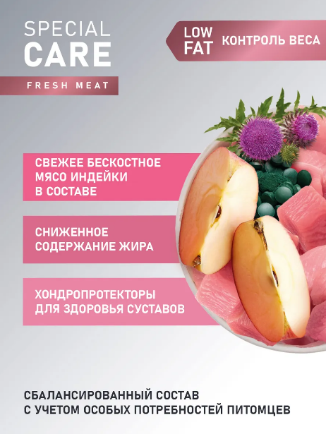 Сбалансированный полнорационный сухой корм со свежим мясом индейки с добавлением расторопши, яблока и спирулины - это функциональное питание для взрослых собак всех пород, которое поддерживает идеальный вес питомца благодаря сниженному содержанию жира и источникам биологически активных веществ в составе, обеспечивая комплексную заботу о здоровье вашего питомца на долгие годы.
