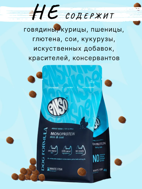 ENSO Dog formula Monoprotein – сухой полнорационный корм для взрослых собак мелких и миниатюрных пород со свежей белой рыбой с добавлением брокколи
