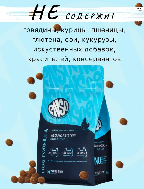 ENSO Dog Formula – гипоаллергенная линия сухих кормов класса суперпремиум холистик для ежедневного поддержания здоровья собак с высоким содержанием свежего мяса (20%) без курицы и куриного жира, сои, пшеничного глютена и ГМО.