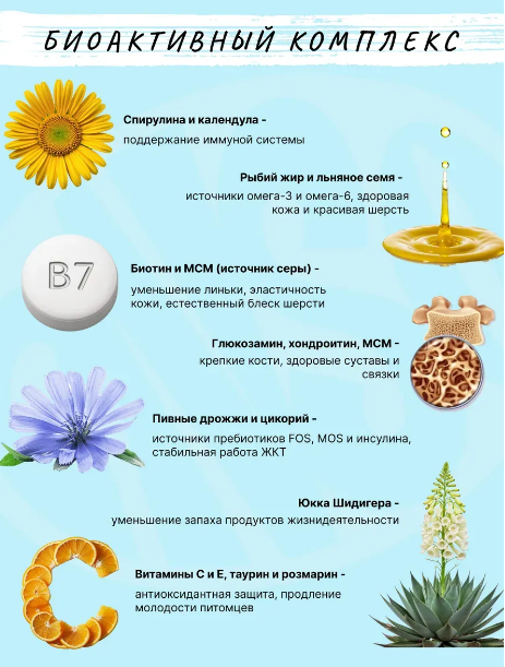 Биотин и МСМ (источник серы) – уменьшение линьки, эластичность кожи, естественный блеск шерсти