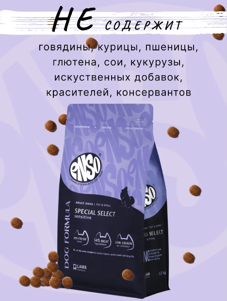ENSO Dog Formula – гипоаллергенная линия сухих кормов класса суперпремиум холистик для ежедневного поддержания здоровья собак с высоким содержанием свежего мяса (20%) без курицы и куриного жира, сои, пшеничного глютена и ГМО.