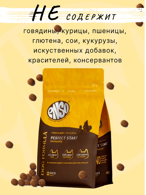 ENSO Dog formula Perfect start – сухой полнорационный корм для щенков от 1 месяца, беременных и кормящих собак мелких и миниатюрных пород со свежей уткой с добавлением яблок