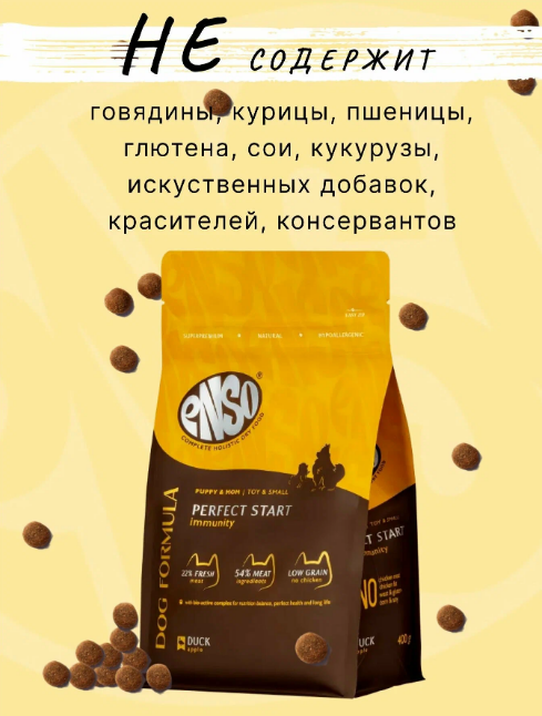 ENSO Dog formula Perfect start – сухой полнорационный корм для щенков от 1 месяца, беременных и кормящих собак средних и крупных пород со свежей уткой с добавлением яблок