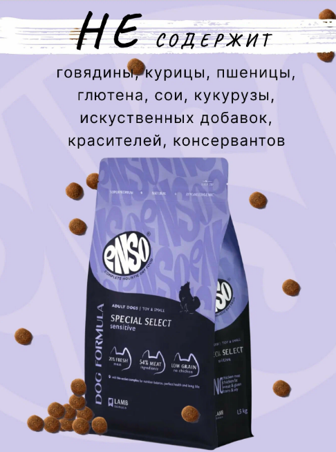 ENSO Dog Formula – гипоаллергенная линия сухих кормов класса суперпремиум холистик для ежедневного поддержания здоровья собак с высоким содержанием свежего мяса (20%) без курицы и куриного жира, сои, пшеничного глютена и ГМО.