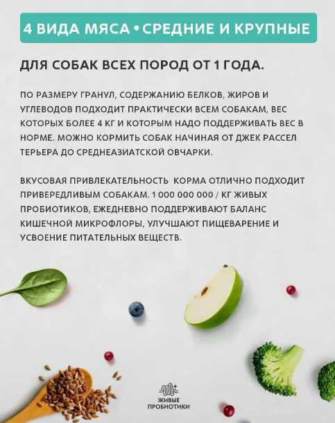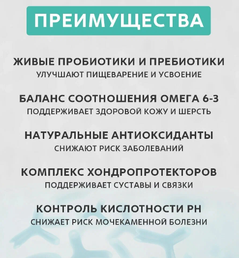 Идеально подходит питомцам с чувствительным пищеварением или склонным к аллергии. Миллиард живых пробиотиков ежедневно поддерживают микрофлору кишечника, улучшают пищеварение, усвоение питательных веществ и предотвращают аллергию. -65% мяса в составе-4 вида диетического мяса-Живые пробиотики-Низкозерновой состав-Гипоаллергенные ингредиенты-25% белки, 15% жиры Не содержит: кукурузу, пшеницу, свеклу, горох, субпродукты, яйца, курицу, куриный жир, соль, сахар, красители, ароматизаторы, сою и ГМО. Тщательно отобранные, натуральные гипоаллергенные ингредиенты, помогают предотвратить аллергические реакции и пищевую непереносимость, обеспечивая иммунное и пищеварительное здоровье. Деликатный способ приготовления сохраняет все полезные свойства и питательные вещества натуральных ингредиентов обеспечивают отличное физическое состояние.
