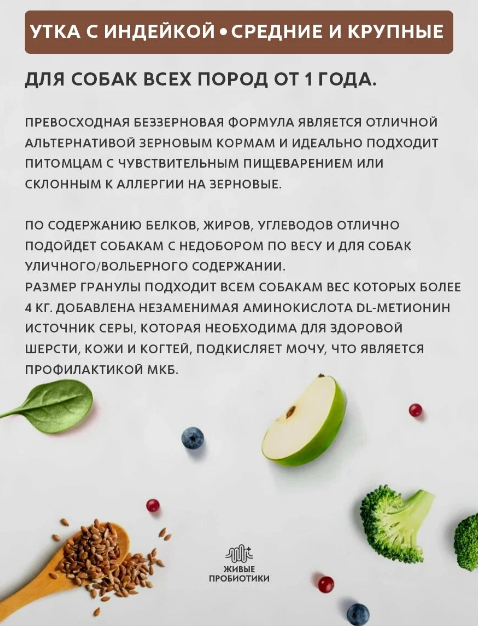 Превосходная беззерновая формула является отличной альтернативой зерновым кормам и идеально подходит питомцам с чувствительным пищеварением или склонным к аллергии на зерновые. Не содержит: зерновые, свеклу, горох, субпродукты, яйца, курицу, куриный жир, соль, сахар, красители, ароматизаторы, сою и гмобеззерновой гипоаллергенный состав в сочетании с диетическим мясом утки и мясом индейки помогает предотвратить аллергические реакции и пищевую непереносимость, обеспечивая иммунное и пищеварительное здоровье. Деликатный способ приготовления сохраняет все полезные свойства и питательные вещества натуральных ингредиентов обеспечивают отличное физическое состояние питомца. Преимущества:-65% мяса в составе корма-0% зерновых (GRAIN FREE)-Только животные белки-Только гипоаллергенные ингредиенты-Только мясо без субпродуктов-Комплекс хондропротекторов-Баланс соотношения Omega 6-3-Контроль уровня кислотности рН-Низкий уровень золы в составе-Натуральные антиоксиданты-Бережный способ приготовления.