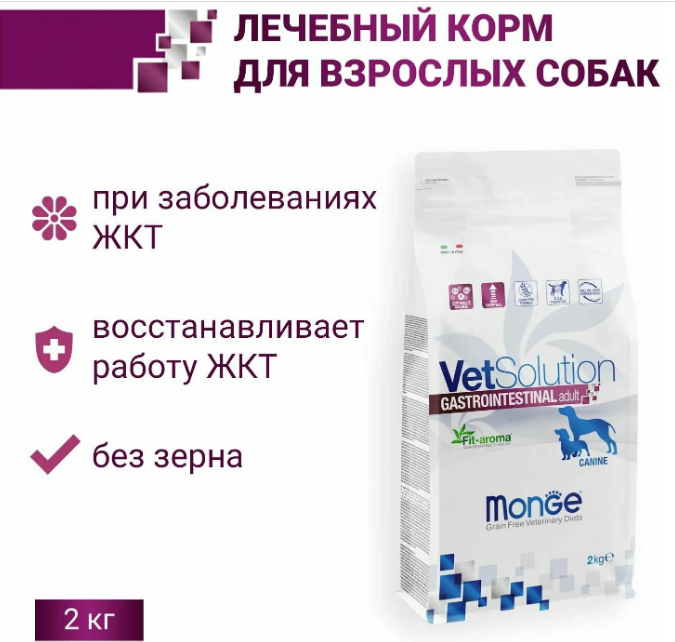 Monge VetSolution Gastrointestinal — это специализированный лечебный корм для взрослых собак, созданный для поддержки здоровья желудочно-кишечного тракта (ЖКТ). Производится в Европе компанией Monge, которая известна высоким качеством своих кормов для животных.