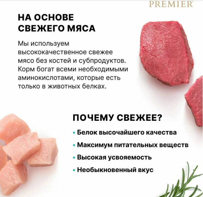 Мы используем свежее мясо высшего сорта, без костей и субпродуктов. Это гарантирует, что ваш питомец получает высокопитательный, чрезвычайно вкусный, легко усвояемый высококачественный источник белка.