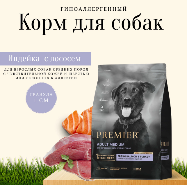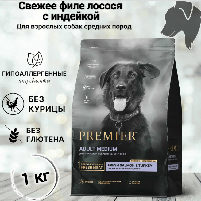 Premier Dog Salmon & Turkey Adult Medium для собак средних пород, свежее филе лосося с индейкой 1кг
