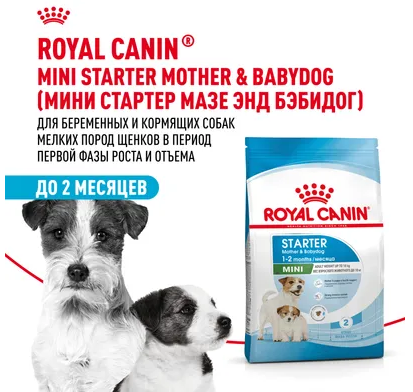 Корм сухой полнорационный для собак мелких пород (до 10 кг) в конце беременности и в период лактации, а также для щенков в период отъема от матери и до 2-х месячного возраста MINI STARTER MOTHER & BABYDOG 1-2 months (МИНИ СТАРТЕР МАЗЕ ЭНД БЭБИДОГ 1-2 месяца) ROYAL CANIN®, подходящий для взрослых собак мелких пород и для щенков в возрасте до 2 месяцев, специально разработан с учетом потребностей вашего щенка в питательных веществах в период роста.