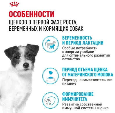 Продукт разработан с учетом потребностей в питательных веществах матери и ее новорожденных щенков. Эта формула подходит для взрослых собак мелких размеров весом до 10 кг, а также для щенков в возрасте до 2 месяцев. Содержание питательных веществ адаптировано к энергетическим потребностям матери в период лактации и щенков мелких пород.