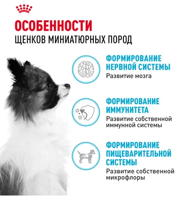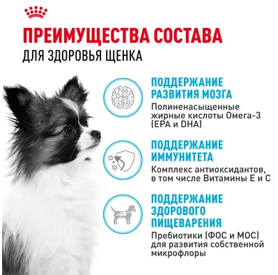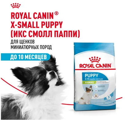 Корм сухой полнорационный для щенков миниатюрных пород (вес взрослой собаки до 4 кг) в возрасте до 10 месяцев X-SMALL PUPPY 2-10 months (ИКС СМОЛЛ ПАППИ 2-10 месяцев) ROYAL CANIN®, подходящий для щенков миниатюрных пород в возрасте до 10 месяцев, специально разработан с учетом потребностей в питательных веществах вашего щенка в период роста.
