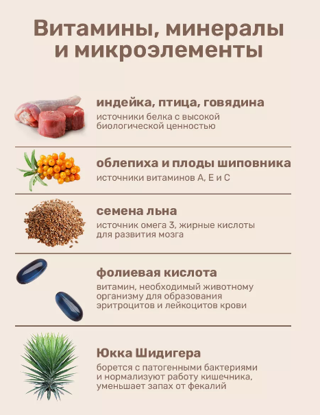 А для развития имунной системы, работоспособности мозга, здоровой кожи и красивой шерсти, мы добавили в сухой корм жирные кислоты Омега 3 и Омега 6.