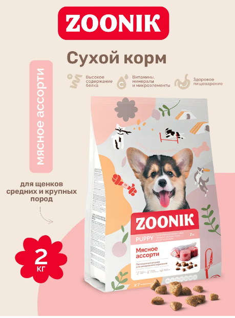 ZOONIK Сухой корм для щенков ср. и кр. пород, Мясное ассорти 2кг