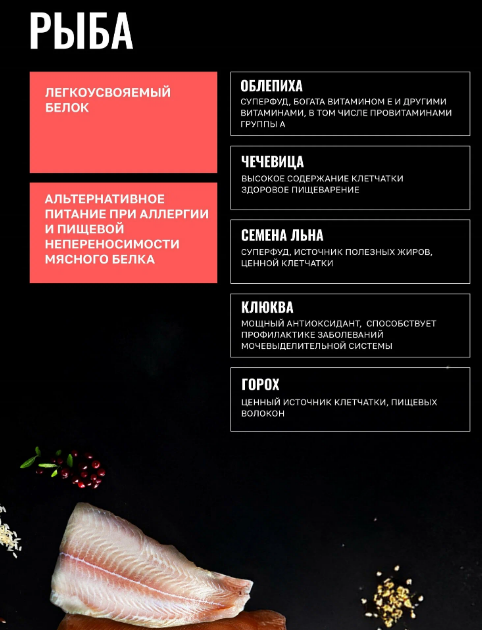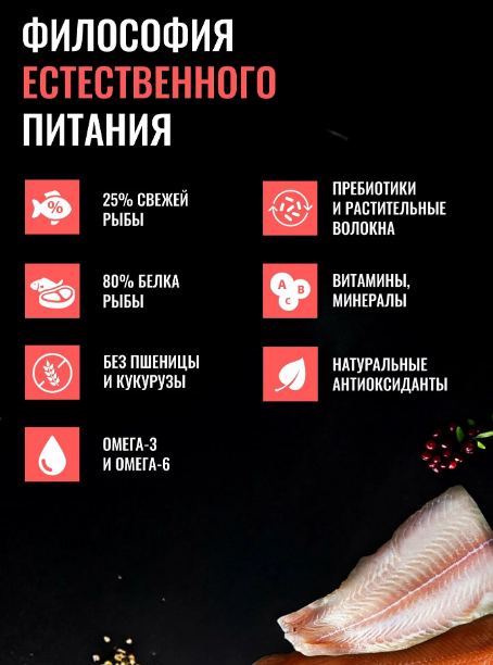 Основной ингредиент корма - свежее мясо рыбы, которое содержит все незаменимые аминокислоты, необходимые для здоровья собак. Благодаря этому, натуральные белки из свежего мяса легко усваиваются организмом животного, способствуя росту и поддержанию мышечной массы.