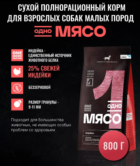 Одно мясо 800г для взрослых собак малых пород с индейкой