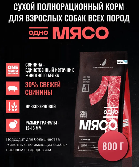Одно Мясо 800гр сухой корм для всех пород со свининой