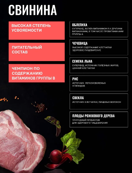 MONOPROTEIN. Свежее мясо содержит все незаменимые аминокислоты, необходимые для здоровья питомцев, натуральные белки из свежего мяса легче усваиваются организмом животных, способствуя росту и поддержанию мышечной массы. Привлекательность вкуса: свежие мясные ингредиенты улучшают вкус и аромат корма, делая его более привлекательным для собак