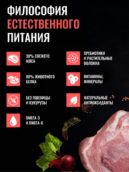 MONOPROTEIN. Свежее мясо содержит все незаменимые аминокислоты, необходимые для здоровья питомцев, натуральные белки из свежего мяса легче усваиваются организмом животных, способствуя росту и поддержанию мышечной массы. Привлекательность вкуса: свежие мясные ингредиенты улучшают вкус и аромат корма, делая его более привлекательным для собак