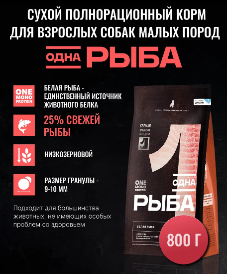 Одно мясо 800г для взрослых собак малых пород с белой рыбой