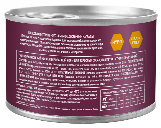 Паштет из утки с кусочками брусники для взрослых собак - это монопротеиновое сбалансированное питание для любимого питомца, изготовленное из одного вида мясного белка без содержания зерна и глютена, с добавлением овощей и фруктов богатых витаминами и минералами.