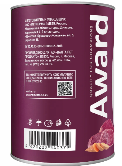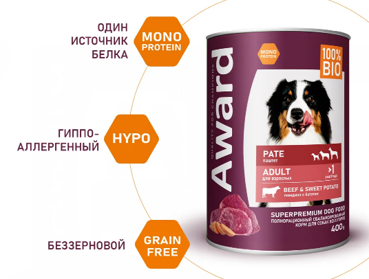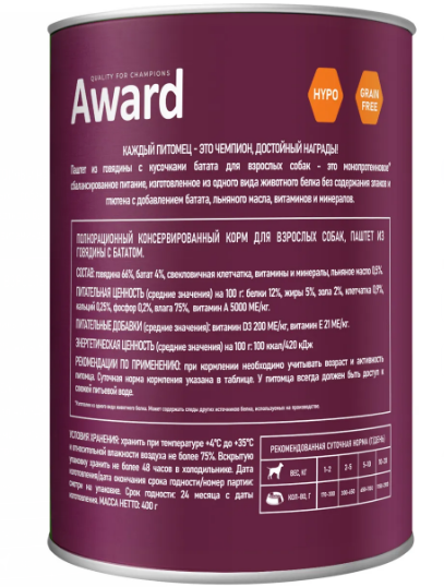 AWARD для взрослых собак паштет из говядины с бататом 400г