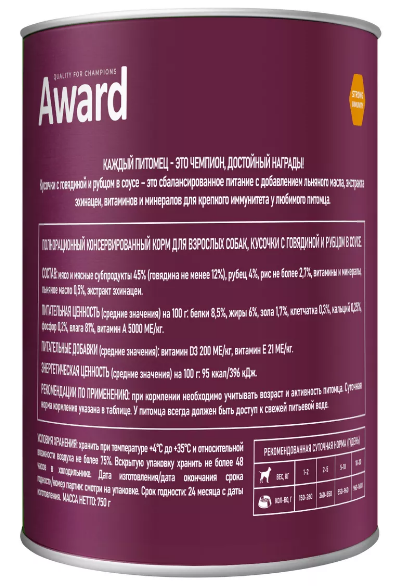 Влажный корм AWARD для взрослых собак кусочки с говядиной и рубцом в соусе 750г.
